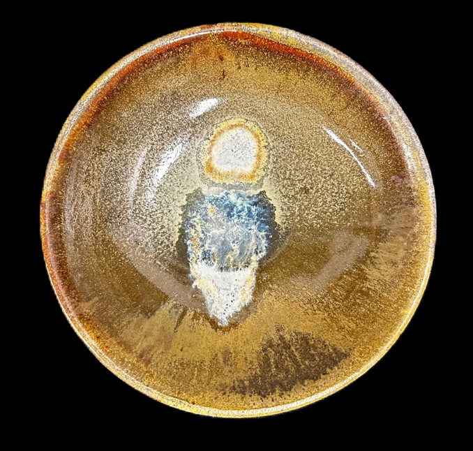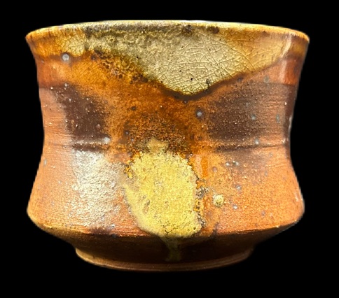 Another yellow salt glaze piece is shown below. During this firing, some white material melted and dripped onto the surface, creating a beautiful halo effect. This was an unexpected and fortunate accident, and I may try to replicate it intentionally in future firings by splashing a similar material onto the piece.