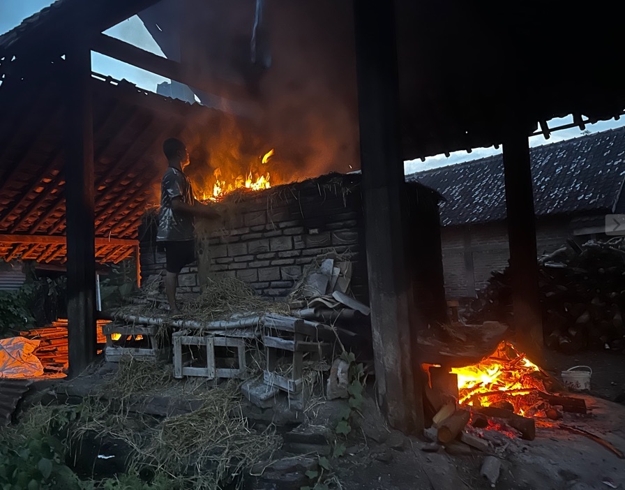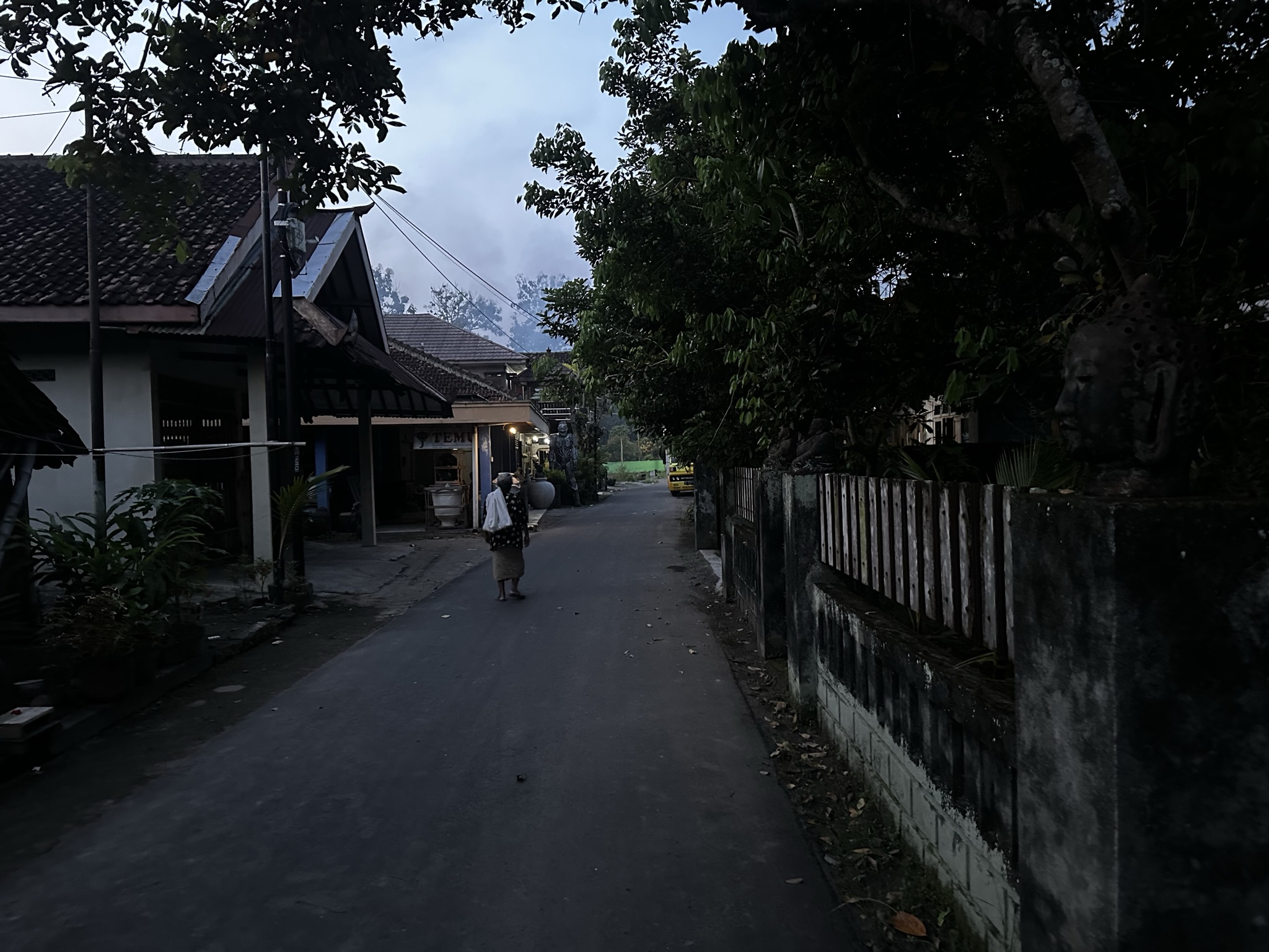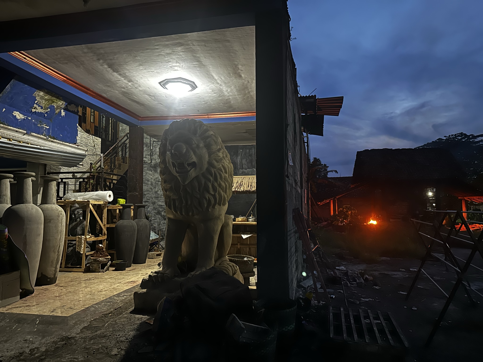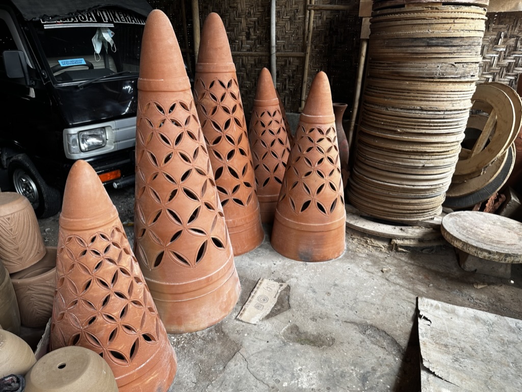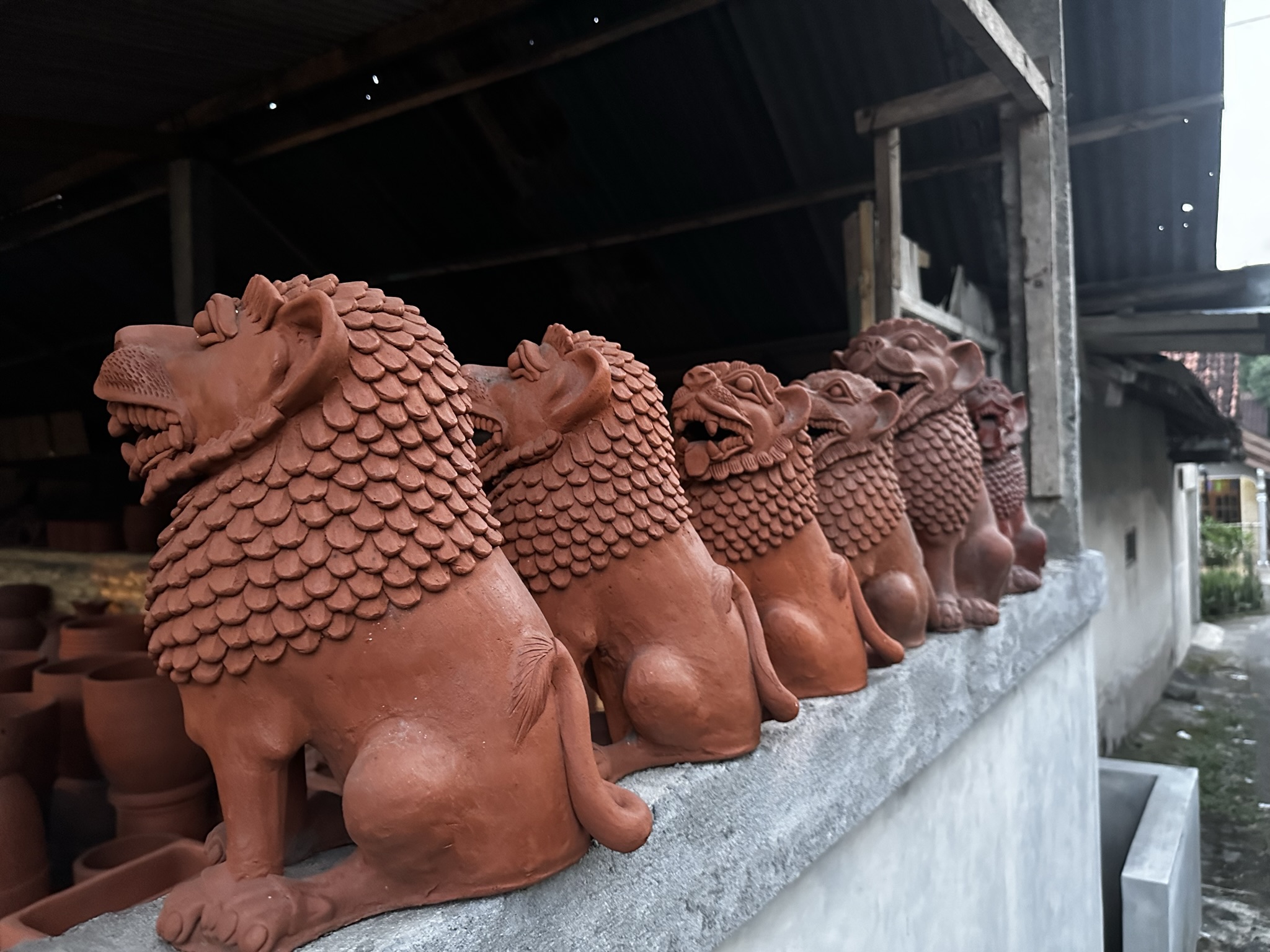 I landed in Yogyakarta, located one hour from Jakarta. It is known as "The City of Culture," "University City," or "The City of Culture" because I wanted to visit a village called Kasongan. The village has been known for pottery since at least 1925 1. When I arrived in the village in the late afternoon, I started hearing loud religious chants everywhere. Half of the storefronts on the main street were still open, and I noticed massive line-ups of terracotta pieces. Most of the forms were large decorative vases and jars. As I glanced at the narrow side road, I saw an old lady walking towards the residential area. I was attracted to the Buddha heads and lions on the walls, so I decided to explore more in that area rather than the storefronts on the main street. As I continued walking, I discovered even more gigantic objects that couldn't fit in those small shops: a 6-foot lion statue, a tall vase, and even more oversized jars. While following the old lady for a while, I caught a whiff of a burning smell. I realized it was coming from a wood-firing kiln.