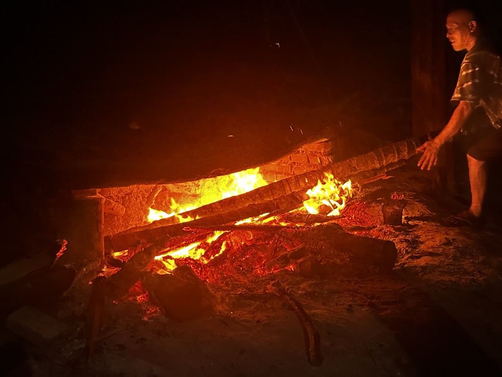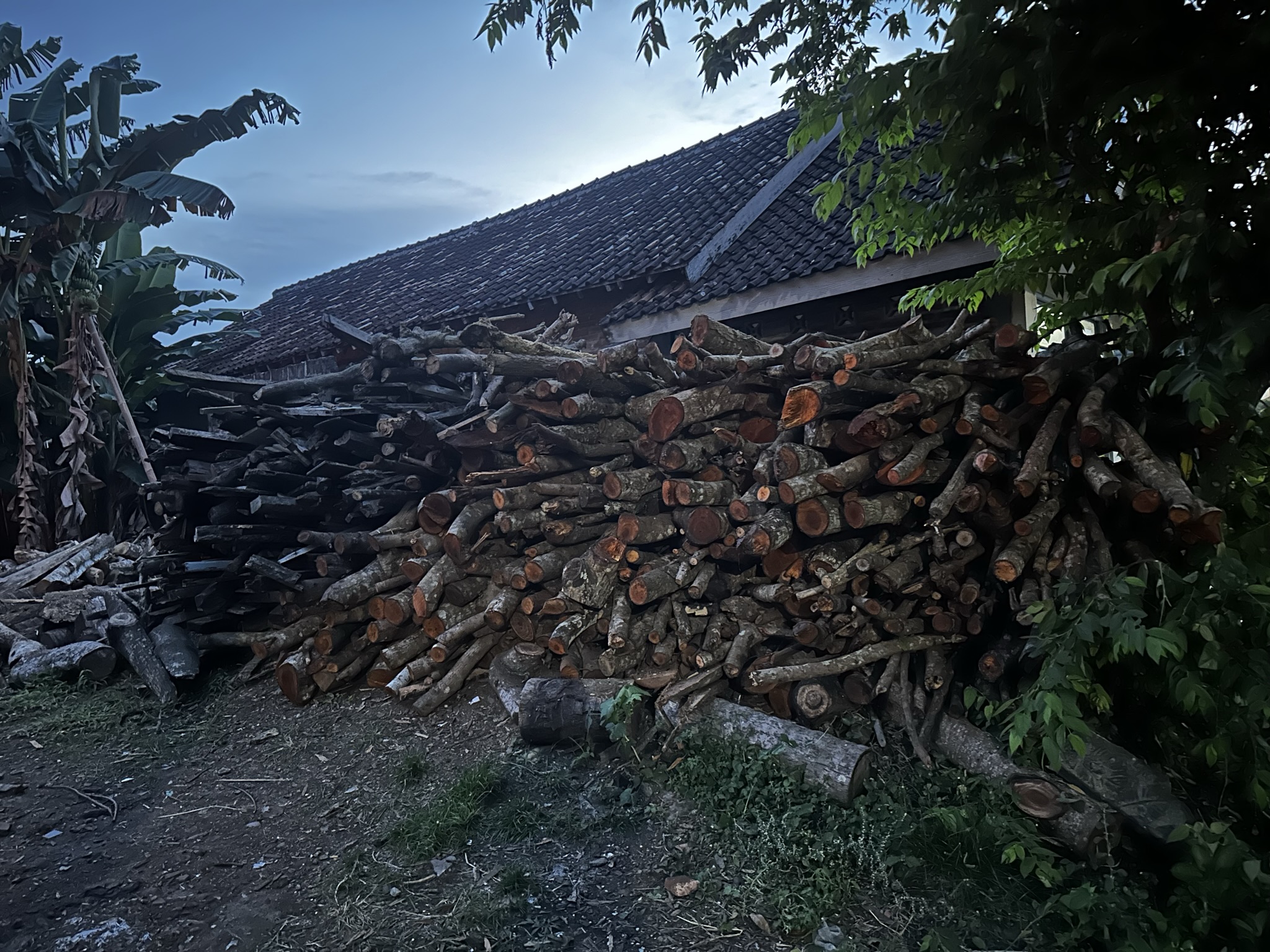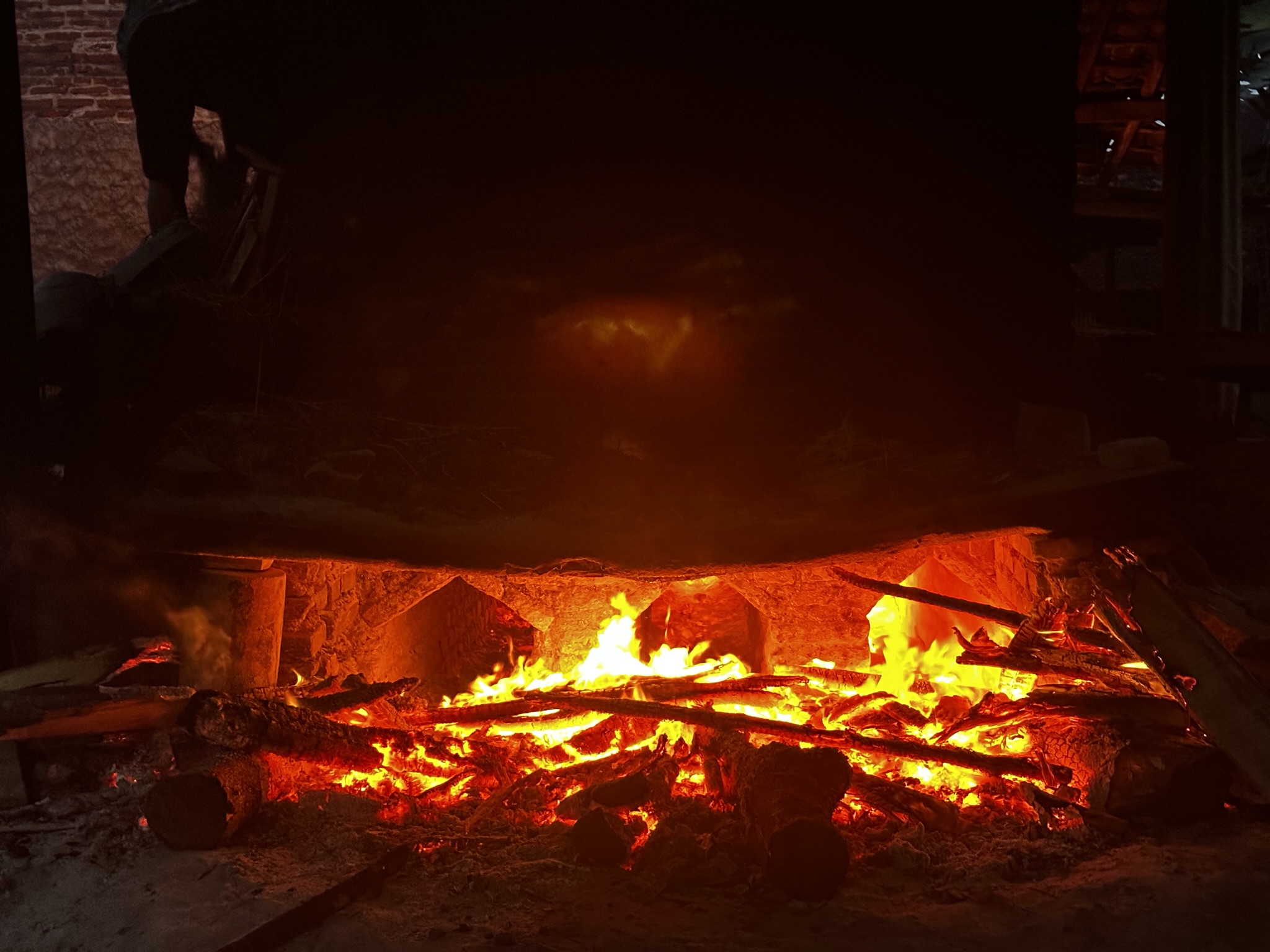 When I walked up to the kiln, I saw a potter working on it. I asked him if I could watch for a while and take some pictures with my phone. He gave me a big thumbs up with a smile. As I observed more closely, I found the firing process to be really interesting. While I wasn't sure if this was a common format for terracotta/low-temperature firing, I noticed that he was throwing straw from the top and stoking very thin, long wood logs from the bottom. When he wasn't busy, I showed him a picture from my previous wood fring. He then offered me the opportunity to throw a couple of logs into the kiln, and of course, I did. Soon, I realized that he was using the long logs placed against the bottom entrance to control the airflow and increase the temperature, I presume. As I looked around, I discovered a location where he kept chopped woods. I noticed some thicker ones, so I believe he had just started the firing process with relatively lighter ones, and those pots were in the preheating stage.