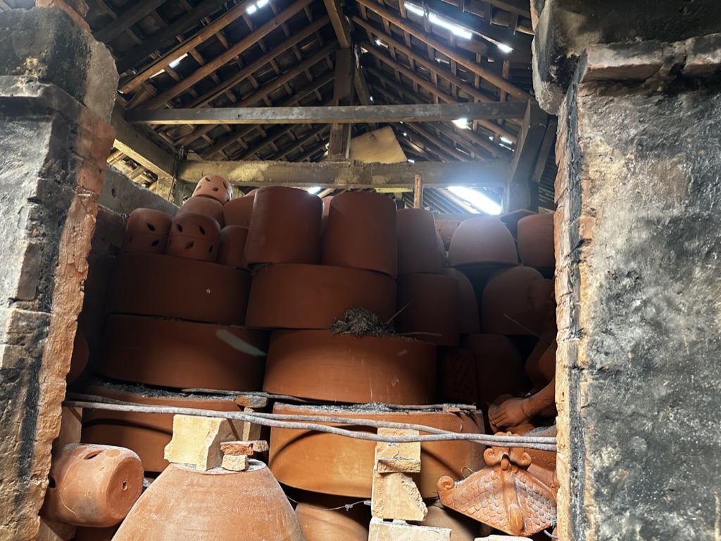 I asked him if I could watch, and he kindly invited me into the remaining space since the entire studio was filled with oversized pots. After he finished his work, he invited me to the back of the studio, where there was a kiln that had just finished firing. I had the opportunity to see how he stacked the pots in the kiln.