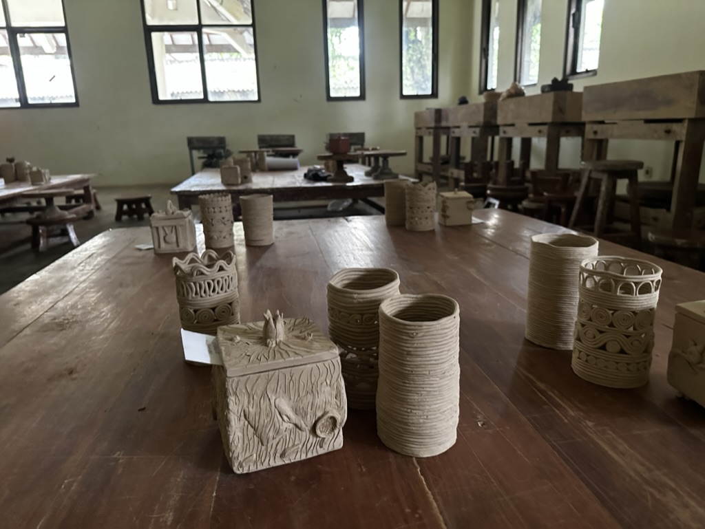 After visiting Kasongan, I headed to the Indonesian Art Institute, which is located just a few miles away. I had already made an appointment, and Mr. Heri Abi kindly gave me a campus tour. He introduced me to the craft and sculpture professors and students. The university covers various disciplines including Fine Arts, Craft, Performing Arts, and more, so I had the chance to see some pottery projects as well. The campus was large, and I noticed a conference being held there.