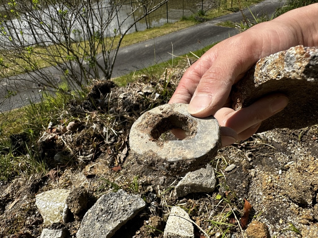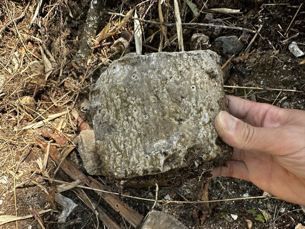 Shigaraki proved to be a wonderful place to visit after our family event in Kyoto. Upon arrival, Shinohara warmly welcomed me into his studio. His wife runs a cafe/restaurant, and the lunch they served was truly amazing. I spent nearly half a day with him, during which he took me to various places. He gave me a tour of his studio and then led me across the street. There, we encountered exposed layers of rough clay along the hill, remnants of an old anagama kiln. As we walked along, he pointed out numerous ceramic pieces scattered on the ground. These included ancient wadding, shelves, saggars, and broken pots. The thin, white broken pots resembled Kyoyaki and were distinct from the contemporary Shigaraki style, indicating that Kyoto served as the main market where a more sophisticated style was preferred.