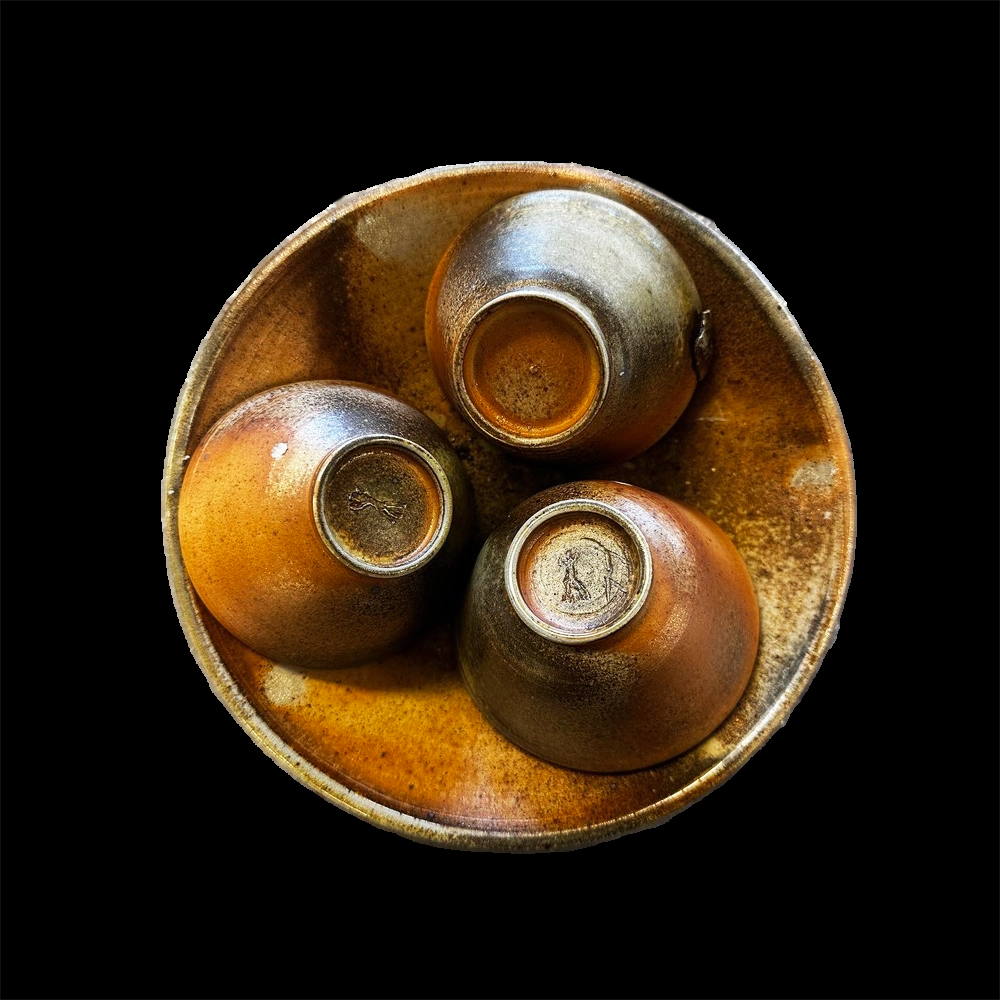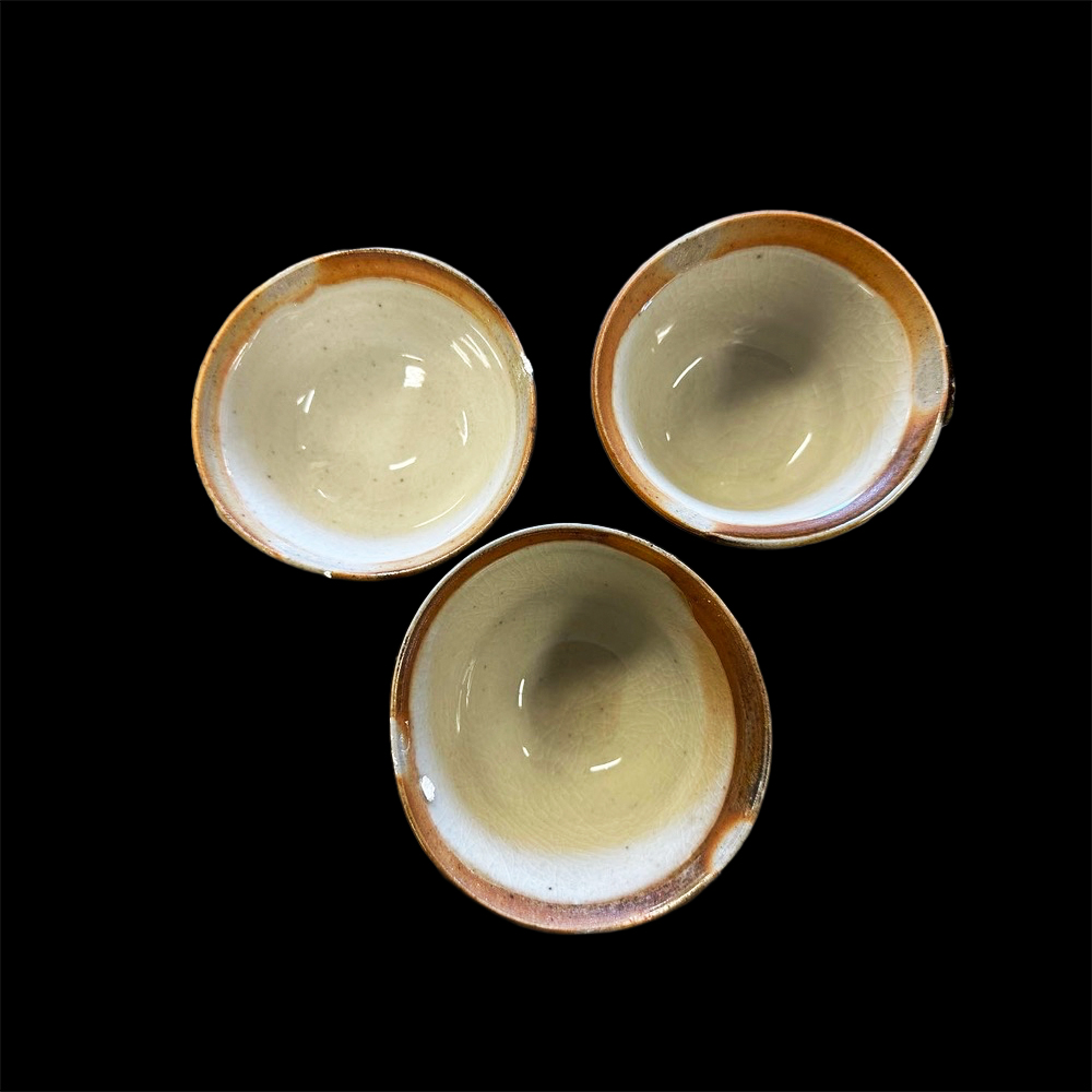 - Description: Thrown with white stoneware body, and it was fired with 3 cups flipped in order to make fire marks "Botan Mochi". The result of this woodfiring piece was success, and the distinctive flame direction appeared along the valley of cups. Inside cups are glazed with white traditional shino.