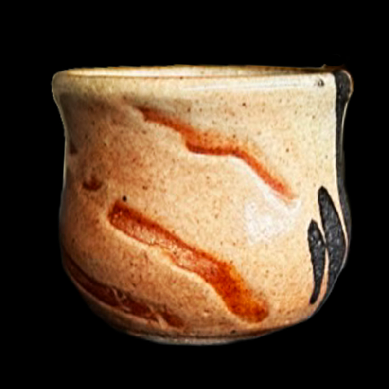 - Description: Salmony pink and white shino cup. Rough surface black iron stain and scratched surface on the shino.
