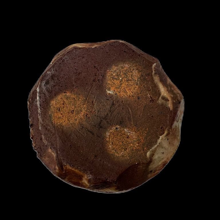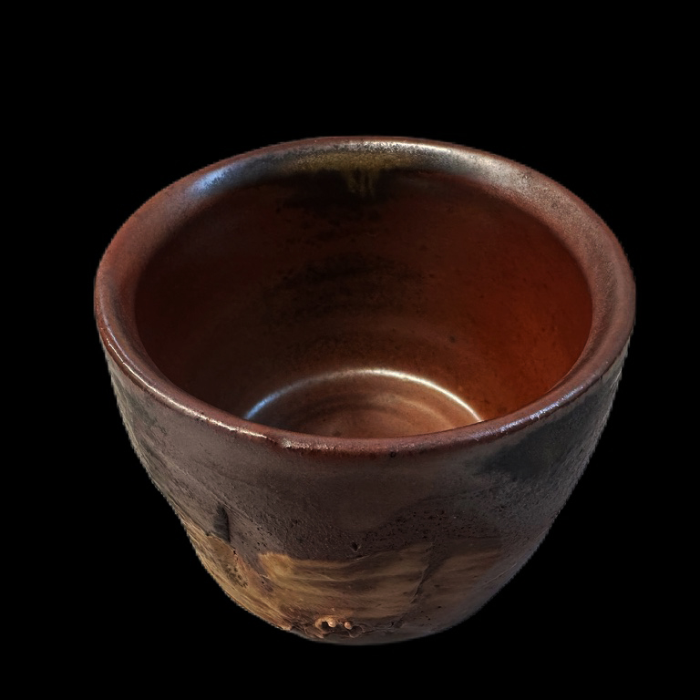- Description: This large size whiskey cup reveals iron-rich clay body through the sliced surfaces. Thick porcelain slip was slapped from the bottom to top.