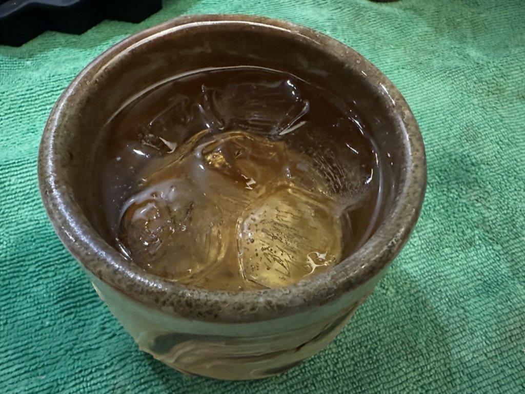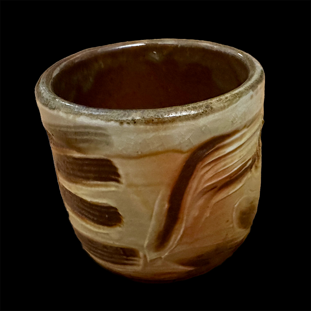 - Description: Relatively large size whiskey cup with thick wall. Scraped slip with sea shell.
