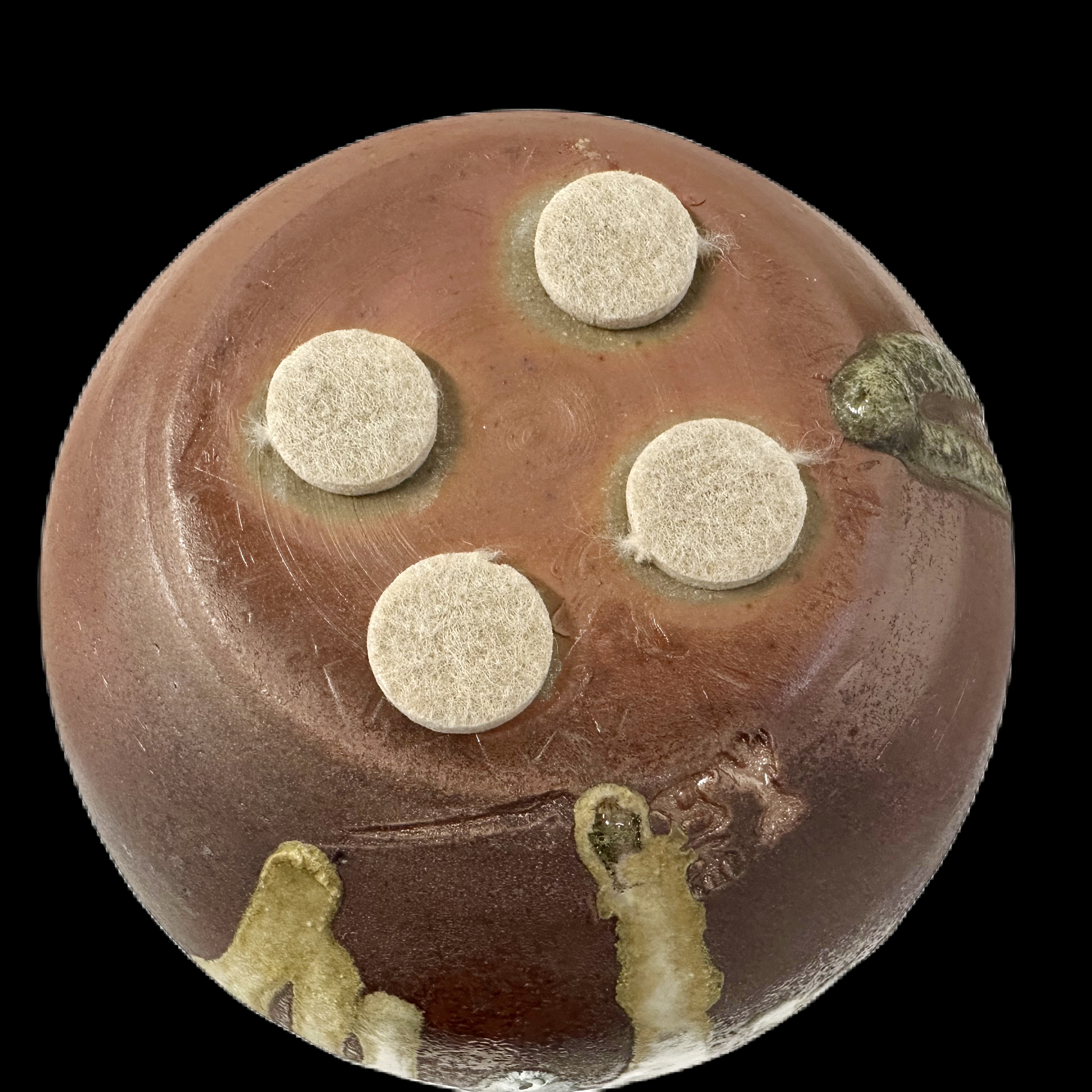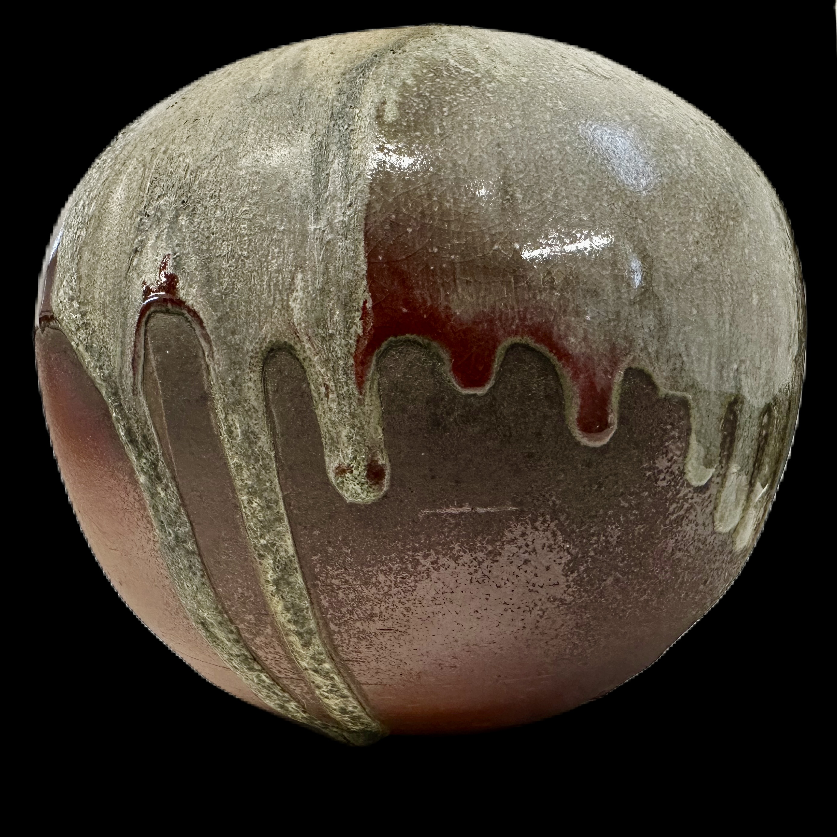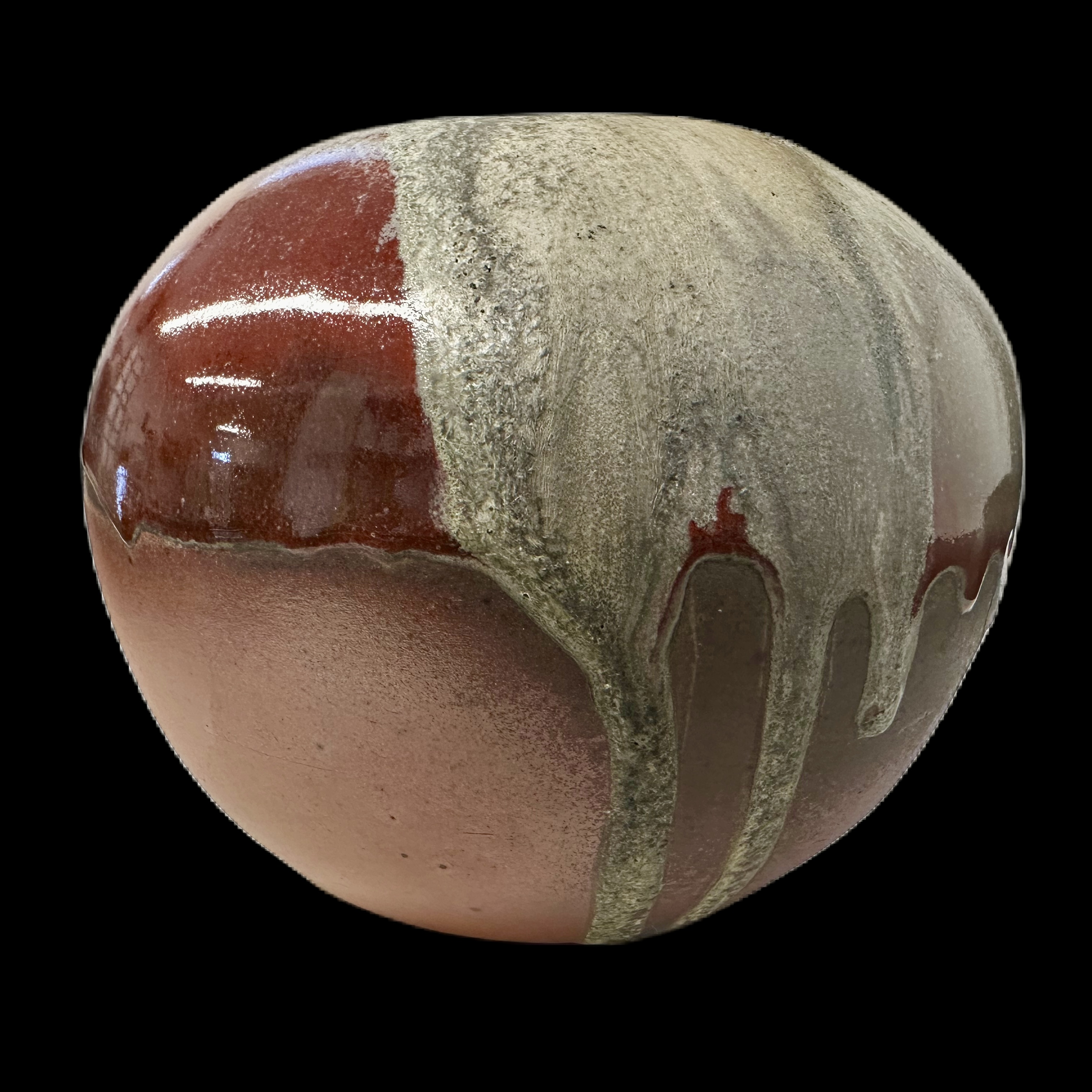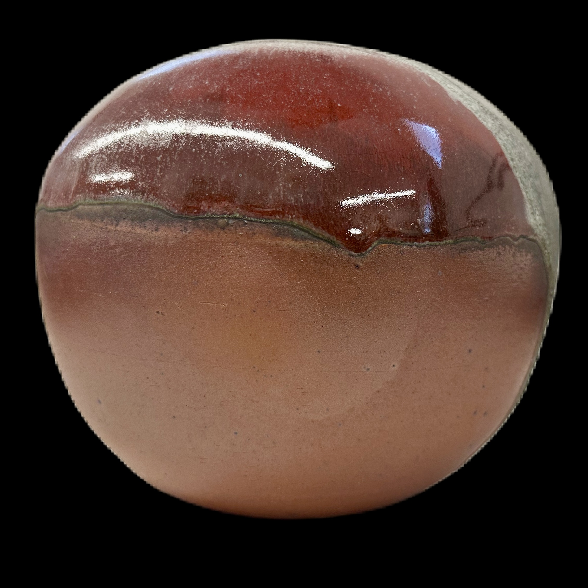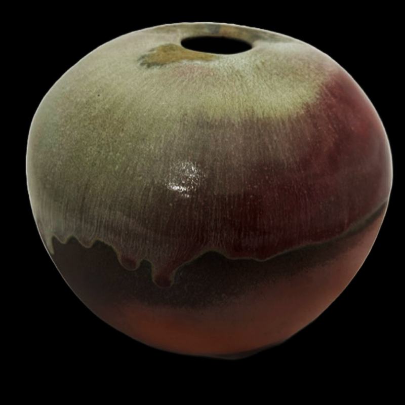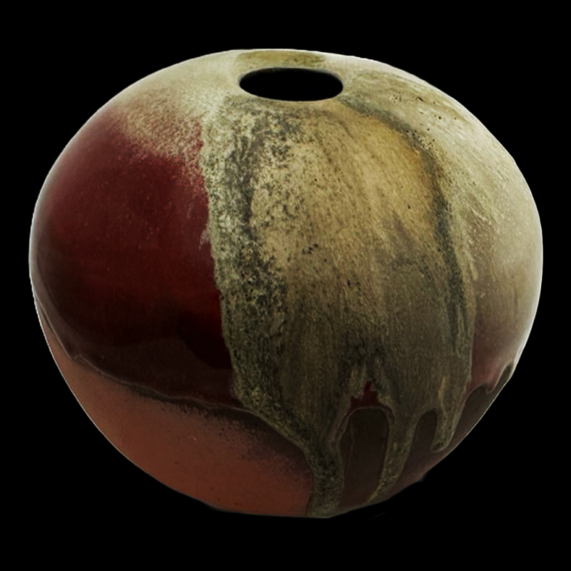 Description: Erupu, which is named after "red" in Telugu, is a reflection of Kiichi's journey when he traveled around the southeast region of India where he encountered the vast natural landscape during the sunset. This earthy red toned moon vase features combination of natural wood ash and copper rich glaze, and they are creating a powerful blend of colors on toasty body.