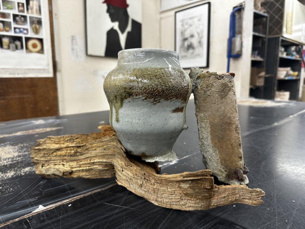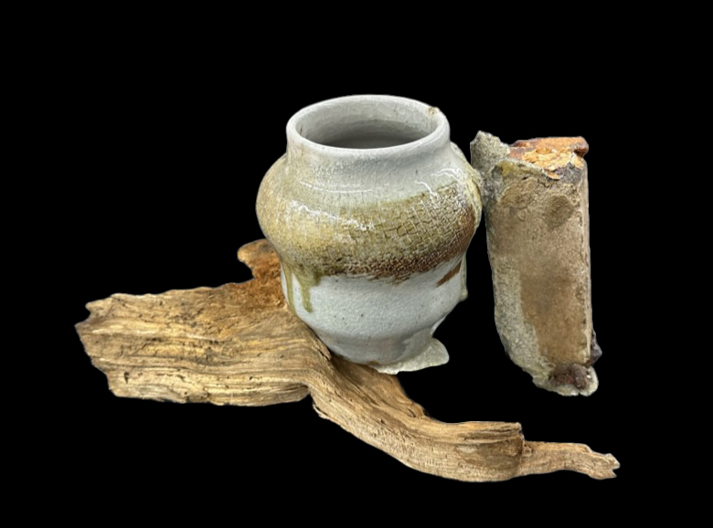 - Description: The jar exposes bold shoulder with its rough but glassy natural wood ash glaze. The neck part features the traditional white shino glaze surface where you might explorer dynamic crackle patterns. Kiichi has been actively involved to build and fire Anagama (Woodfire Kiln) at Trevor Youngberg’s Kiln Yard (Woodbridge, Conn.) , and this composit form develops strong architectural feel since all 3 pieces were built from the site. The new Anagama, Beluga-Gama, which he participated to build, fire bricks were donated by Long Island University. Although it revealed tremendous successful outcomes in the first firing itself, because of the nature of the first firing, a lot of drama happended inside the kiln. Especially, when it reached Cone 13 temperature (2450 F) after a few days, something from above landed on this pot. The attached brick is actual kiln shelf support. It was merged into the jar side by the kiln god - since wall material might have fallen; yes, it was the artist's descision to keep the brick to reflect the will of the kiln. With fallen wall material together on the side, the bottom wood piece was integrated underneath. Attatched wood foundation is the one of actual fuel for firing. Together with the jar, brick, and wood, the dynamic form creates synergy through the earthy materials of the jar.